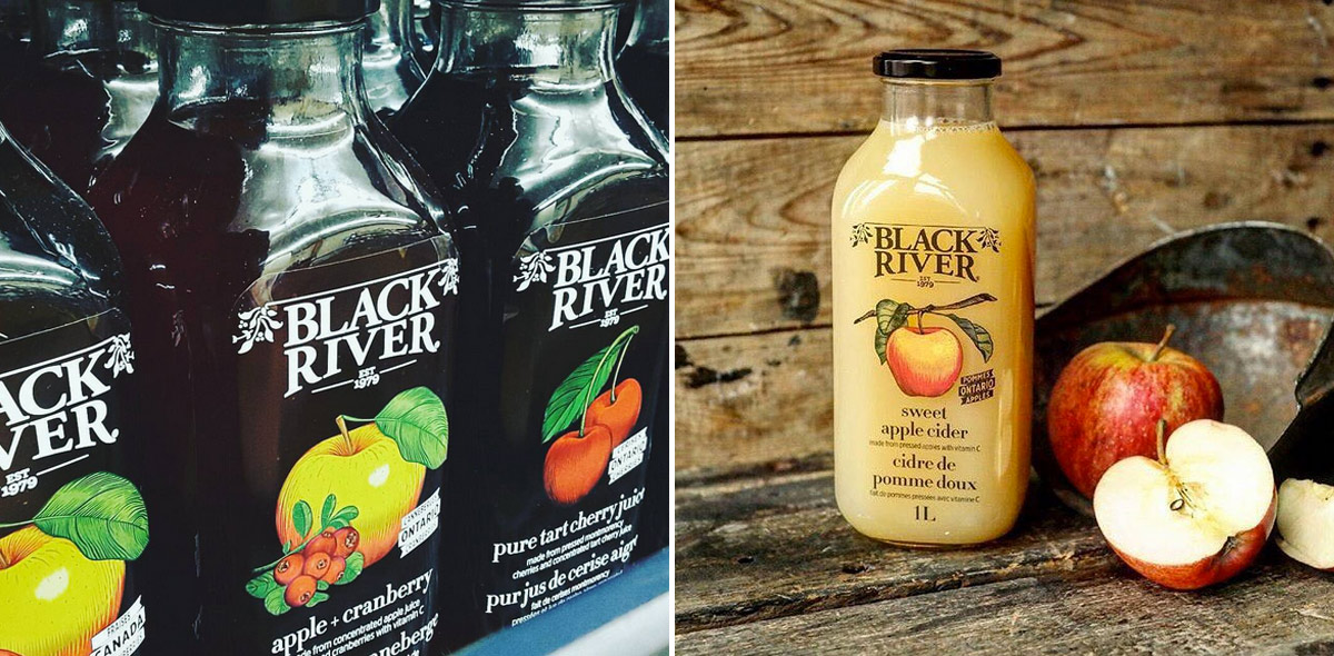 A recent redesign was a complete change of packaging including bottle, label and logo redesign. The visual style needed to reflects the brand’s “natural, ‘fresh from the farm’ look.” The new labels were built around vector illustrations performed by Anna. Labels feature 23 fruit flavours. Illustrations and redesign were completed over the course of a year. The idea was to give illustrations one of a kind look of old etching, clean and beautiful. Anna Scetinina made use of her artistic background and past experience with a variety of forms including hands on experience in etching, wood cuts and lithography. One of the biggest challenges was producing vector art that would stand out when printed on clear labels and applied to glass bottles filled with juices ranging in colour from bright yellow to near black.[/vc_column_text][vc_column_text css=”.vc_custom_1470342763172{margin-top: 40px !important;}”]The focus on freshness was further amplified by a new bottle shape. Jessica Praskey (general manager for Black River Juice) says: “We went with the old style milk glass bottle shape because we wanted to convey ‘fresh from the farm’ without actually having to use those words on the label… There is no packaging that better conveys this than the old dairy bottle.”